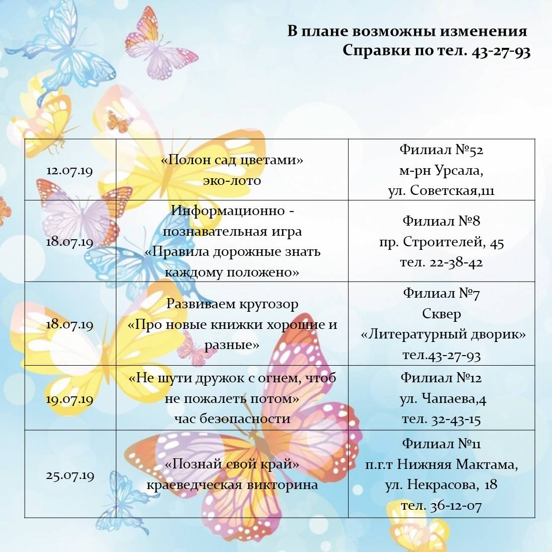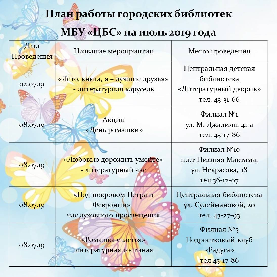 План работы городских библиотек на июль