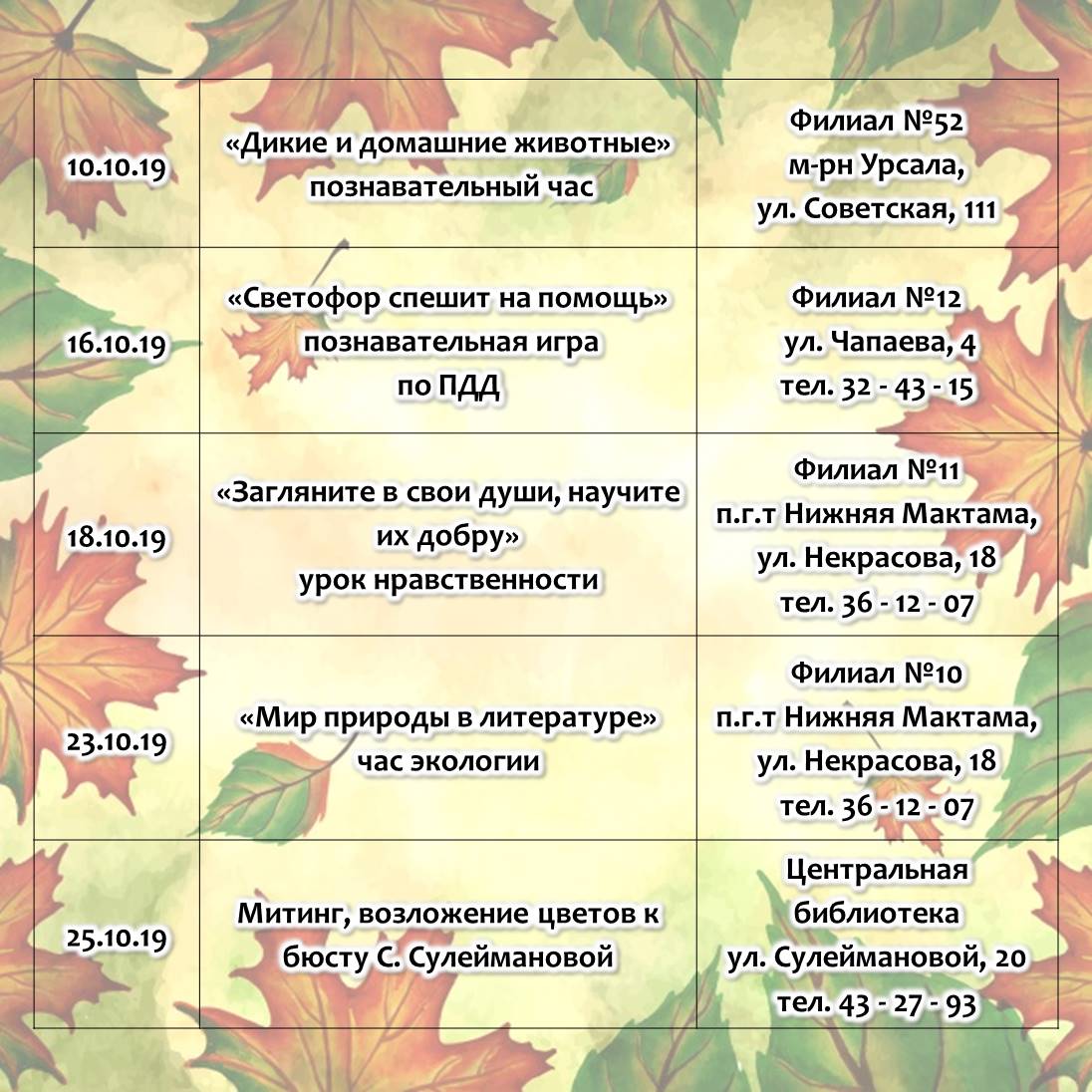 План работы городских библиотек на октябрь