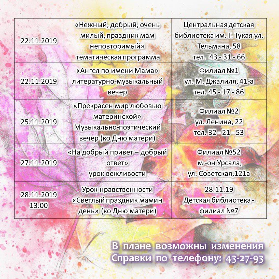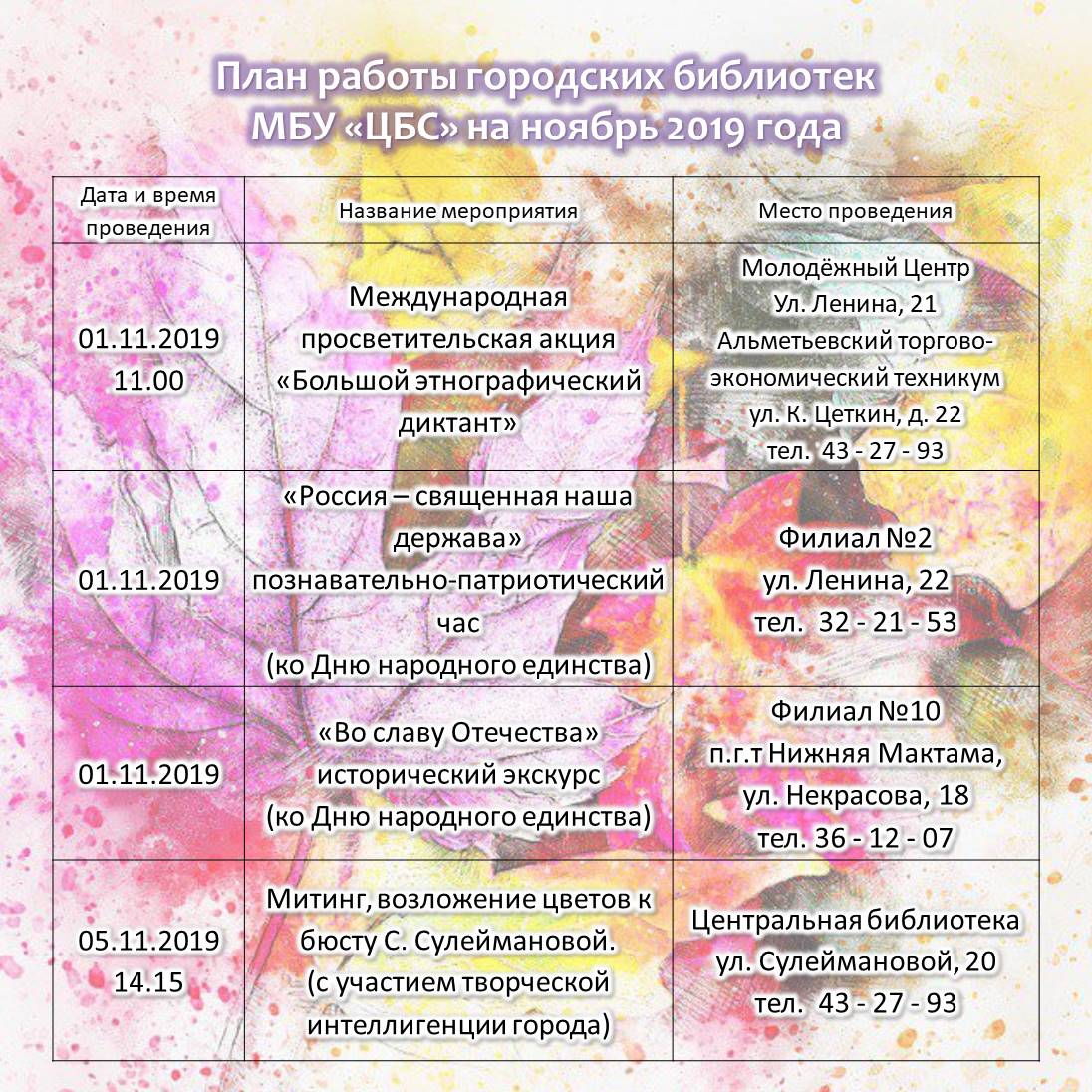 План работы городских библиотек на ноябрь