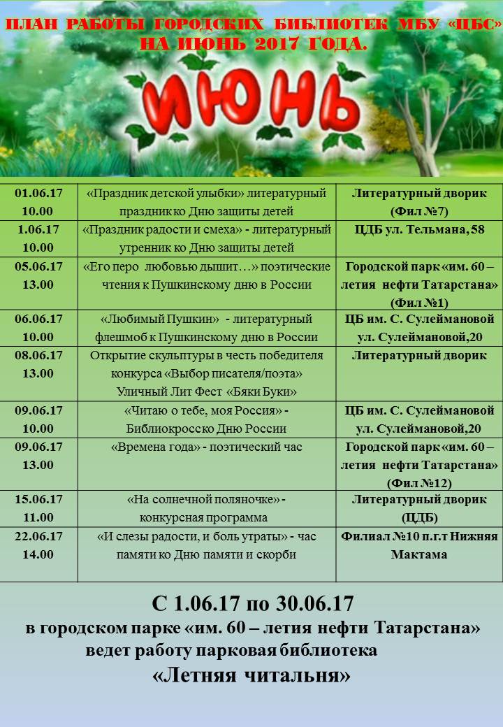 План работы городских библиотек МБУ "ЦБС" на июнь 2017г.