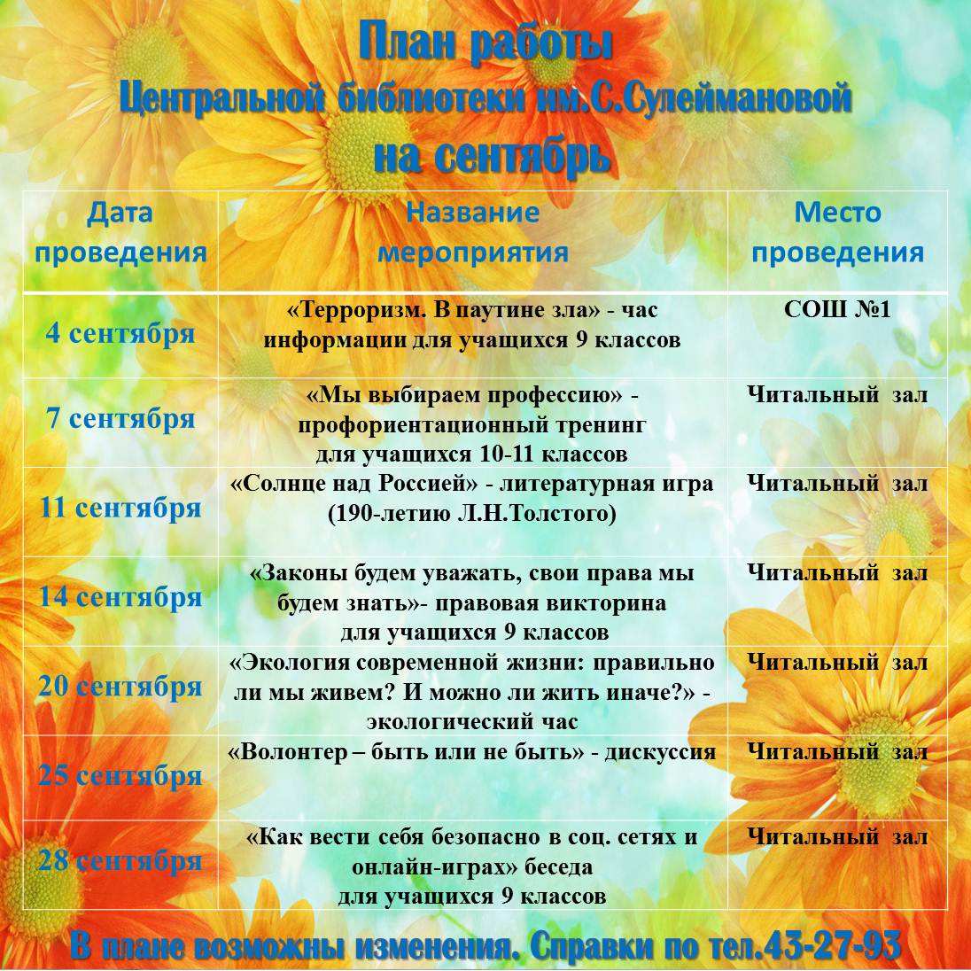 План работы Центральной библиотеки им. С. Сулеймановой на сентябрь