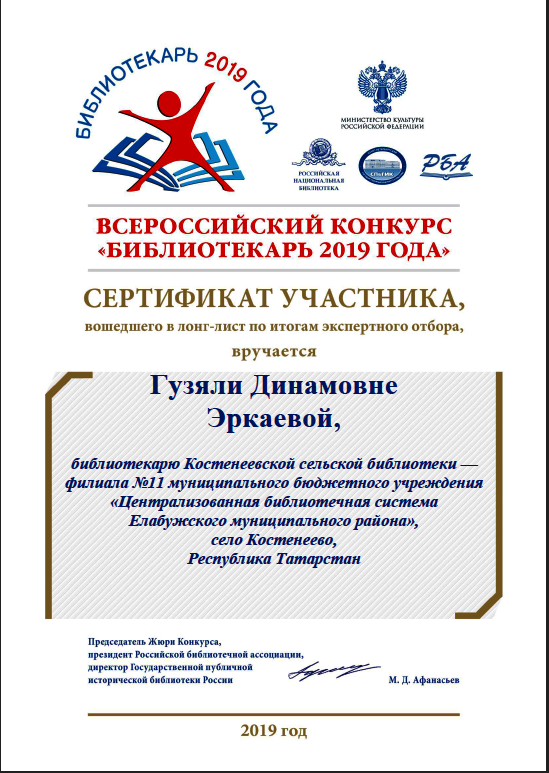 Во Всероссийском конкурсе "Библиотекарь 2019 года", учредителем которого выступило Министерство культуры Российской Федерации, организаторами — Российская национальная библиотека и Санкт-Петербургский государственный институт культуры при поддержке Российской библиотечной ассоциации, Эркаева Гузяль Динамовна вошла в лонг-лист (короткий список) среди 251 номинантов из 56 регионов РФ по итогам экспертного отбора Российской национальной библиотеки, Российской государственной библиотеки и Российской государственной библиотеки для молодёжи . Одна из задач конкурса — формирование образа современного библиотекаря, поэтому неудивительно, почему победили молодые библиотекари. Заместитель директора департамента государственных и приоритетных проектов — начальник отдела сводного планирования и отчетности Российской государственной библиотеки Л. Н. Зайцева предложила подумать о возможности создания ещё одной номинации «Мастер в профессии» для специалистов с большим опытом.