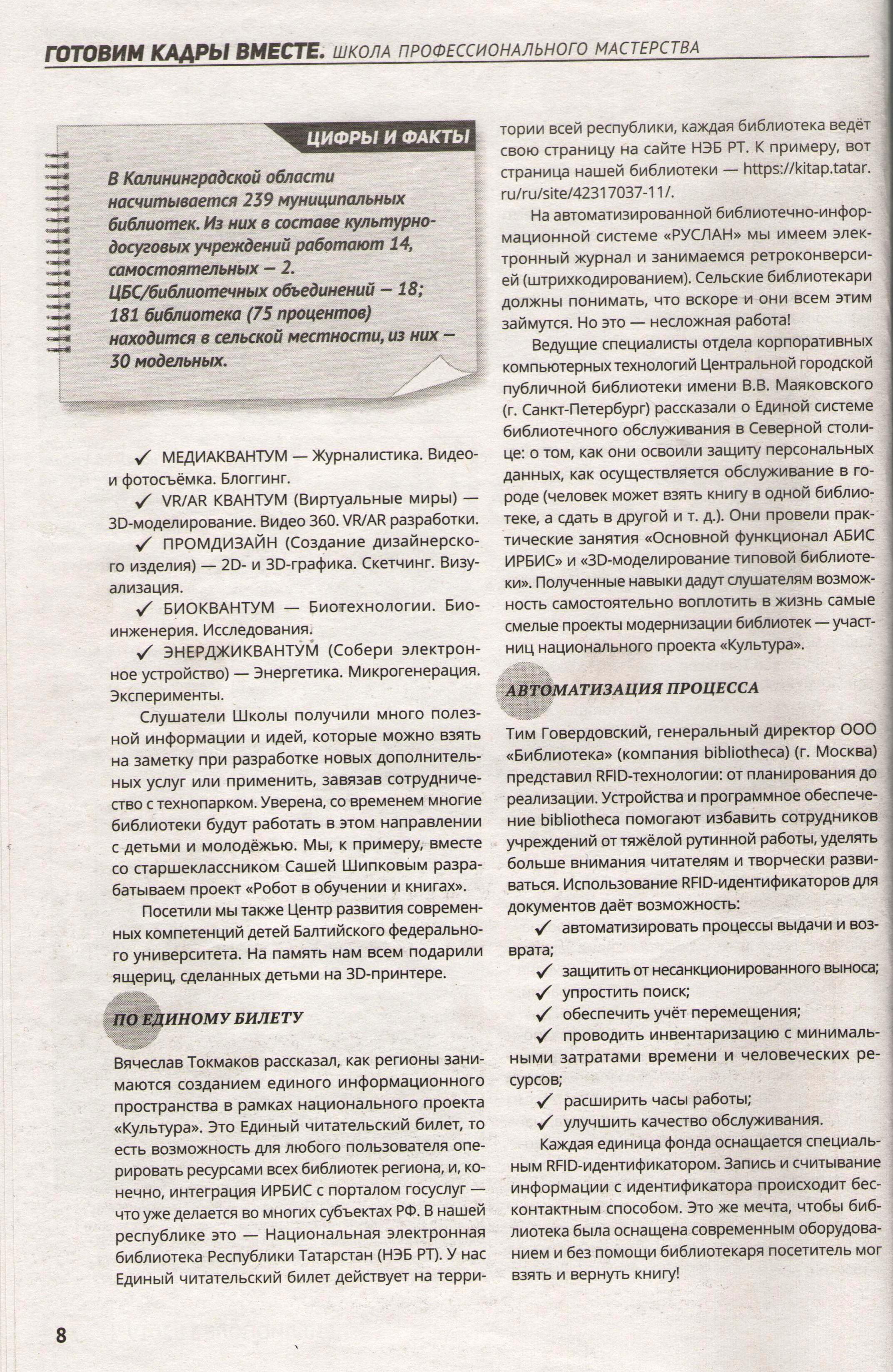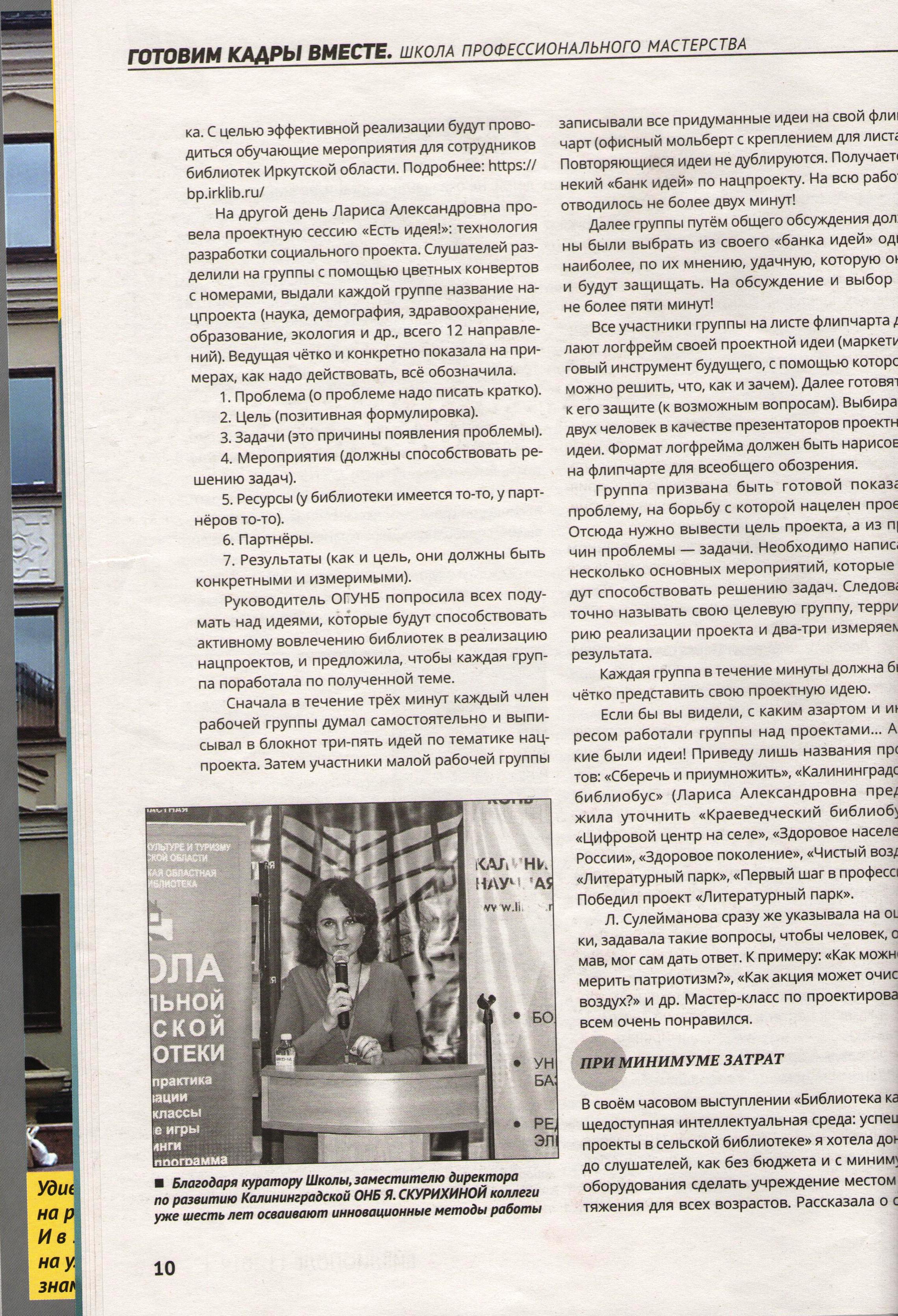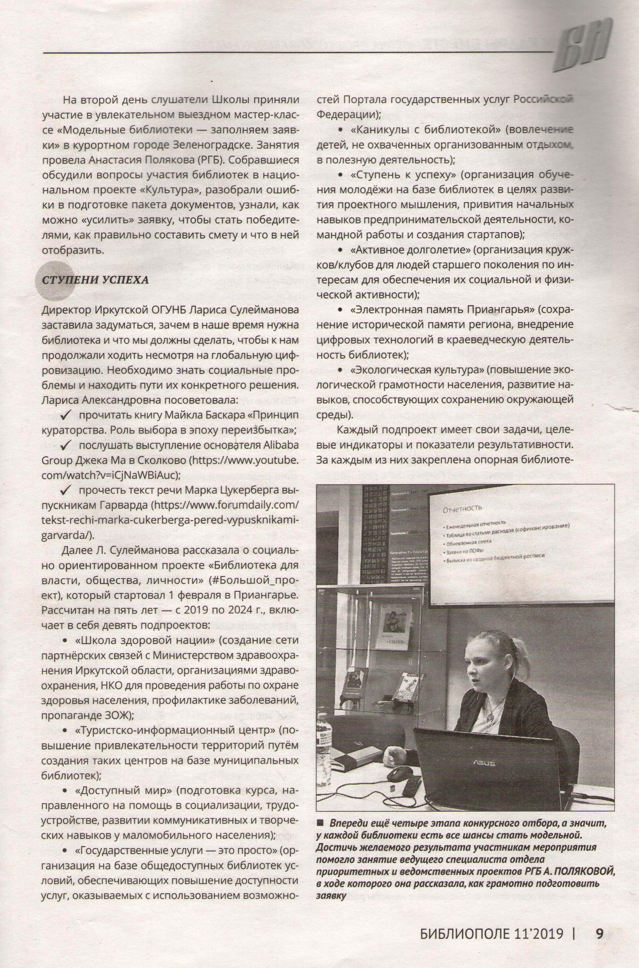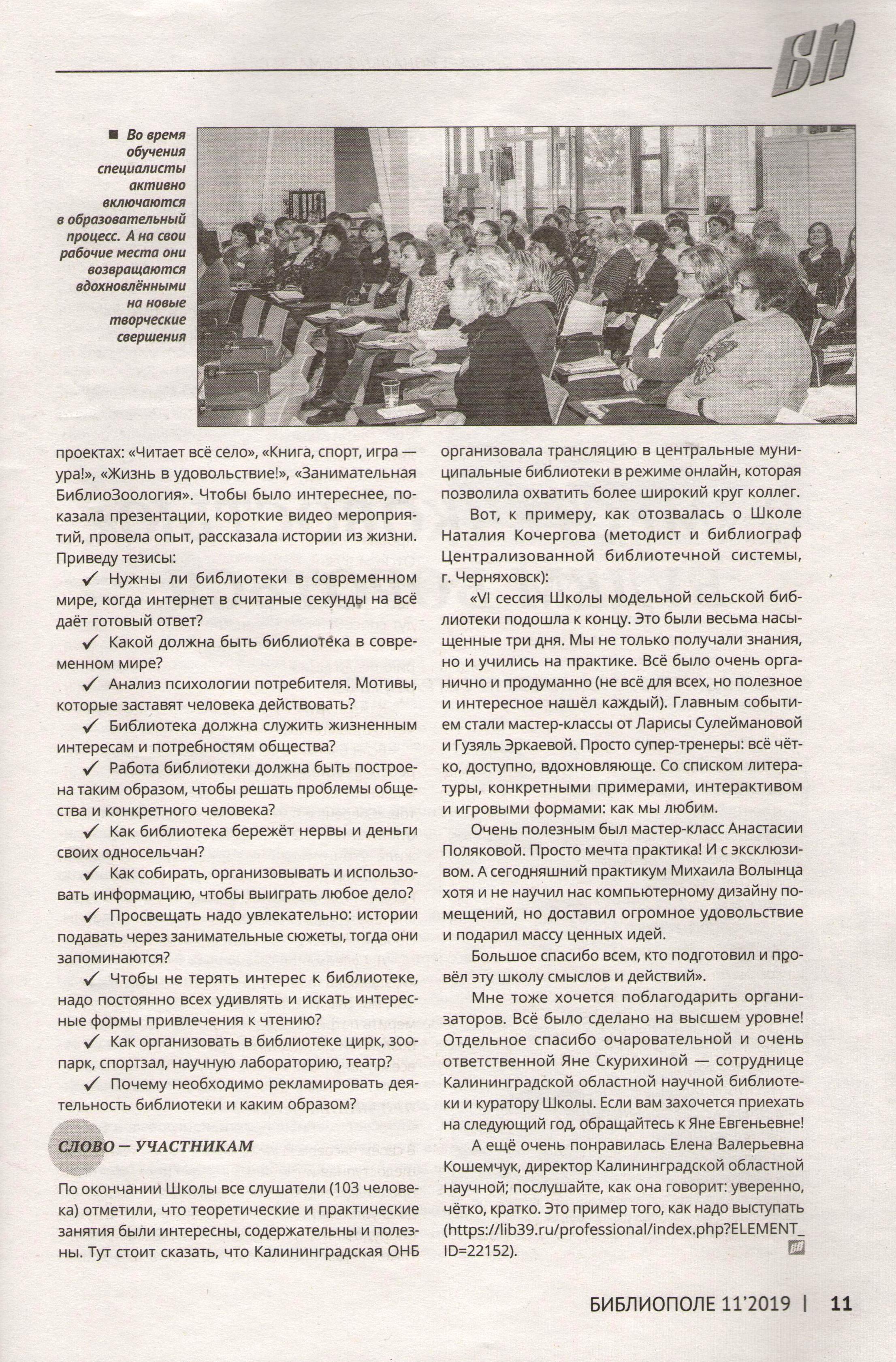 В профессиональном журнале "Библиополе" № 11.2019 г. на страницах 6-11 вышла большая статья Гузяль Эркаевой, библиотекаря Костенеевской сельской библиотеки, под названием "Раз идея, два идея - получается проект" о Школе сельской модельной библиотеки Калининградской ОНБ, в которой она побывала и провела мастер-класс в октябре 2019 года.