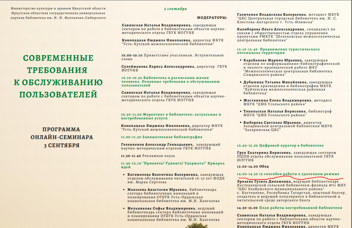 3 сентября Гузяль Эркаева приняла участие в работе онлайн-семинара "Современные требования к обслуживанию пользователей", организованный Иркутской областной государственной универсальной научной библиотеки им. И. И. Молчанова-Сибирского. Эркаева Г.Д. выступила, как опытный блогер, создатель и ведущий популярного в библиотечной и читательской среде авторского блога, тема выступления: " 12 способов работы в удаленном режиме".
