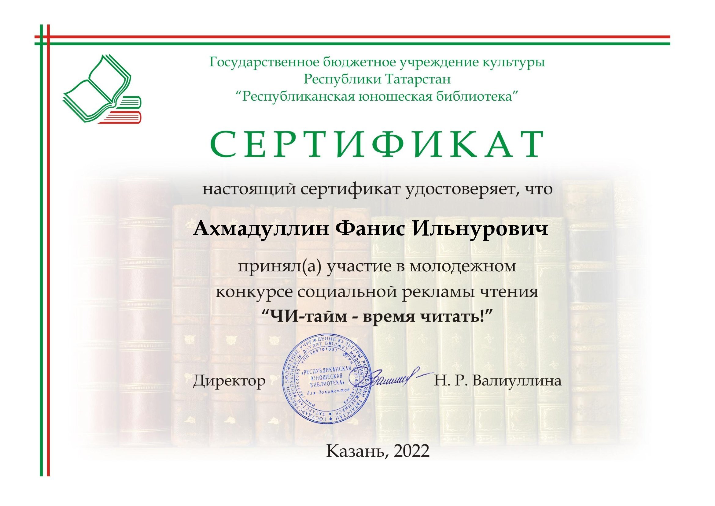 Читатель Старокуклюкской сельской библиотеки, Ахмадуллин Фанис, принял участие в республиканском молодежном конкурсе социальной рекламы чтения «ЧИ-тайм – время читать!» и был отмечен сертификатом.