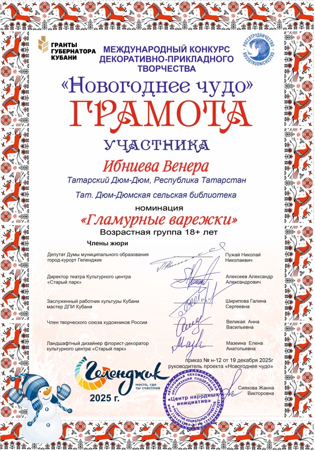 Библиотекарь нашего села приняла участие в Международном конкурсе декоративно-прикладного творчества «Новогоднее чудо», который проходил с 01 октября по 24 ноября 2025 года при поддержке Федерального агентства «Россотрудничество» и программы «Гранты губернатора Кубани».