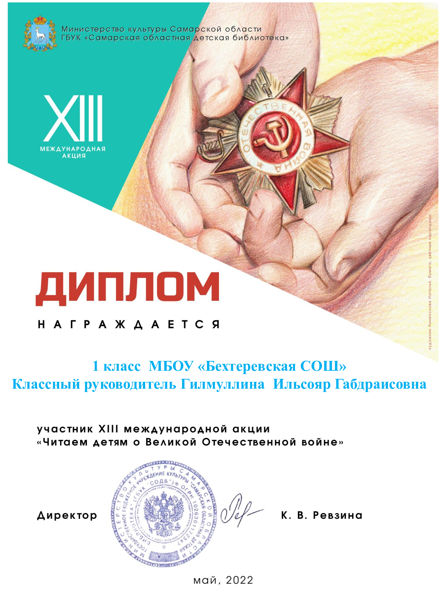 Учащиеся 1 класса Бехтеревской школы участвовали в XIII Международной акции «Читаем детям о войне», объявленной Самарской областной детской библиотекой и получили Диплом участника XIII Международной Акции «Читаем детям о войне»