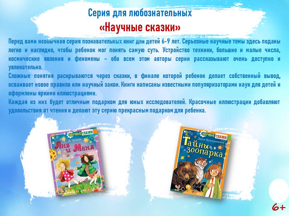 В серии «Научные сказки» издательства «Аванта» в настоящее время издано 37 книг. Серия охватывает много тем для изучения: химия, физика, биология, языкознание, география, психология, астрономия, история. Надеемся на новое поступление книг этой интересной серии.