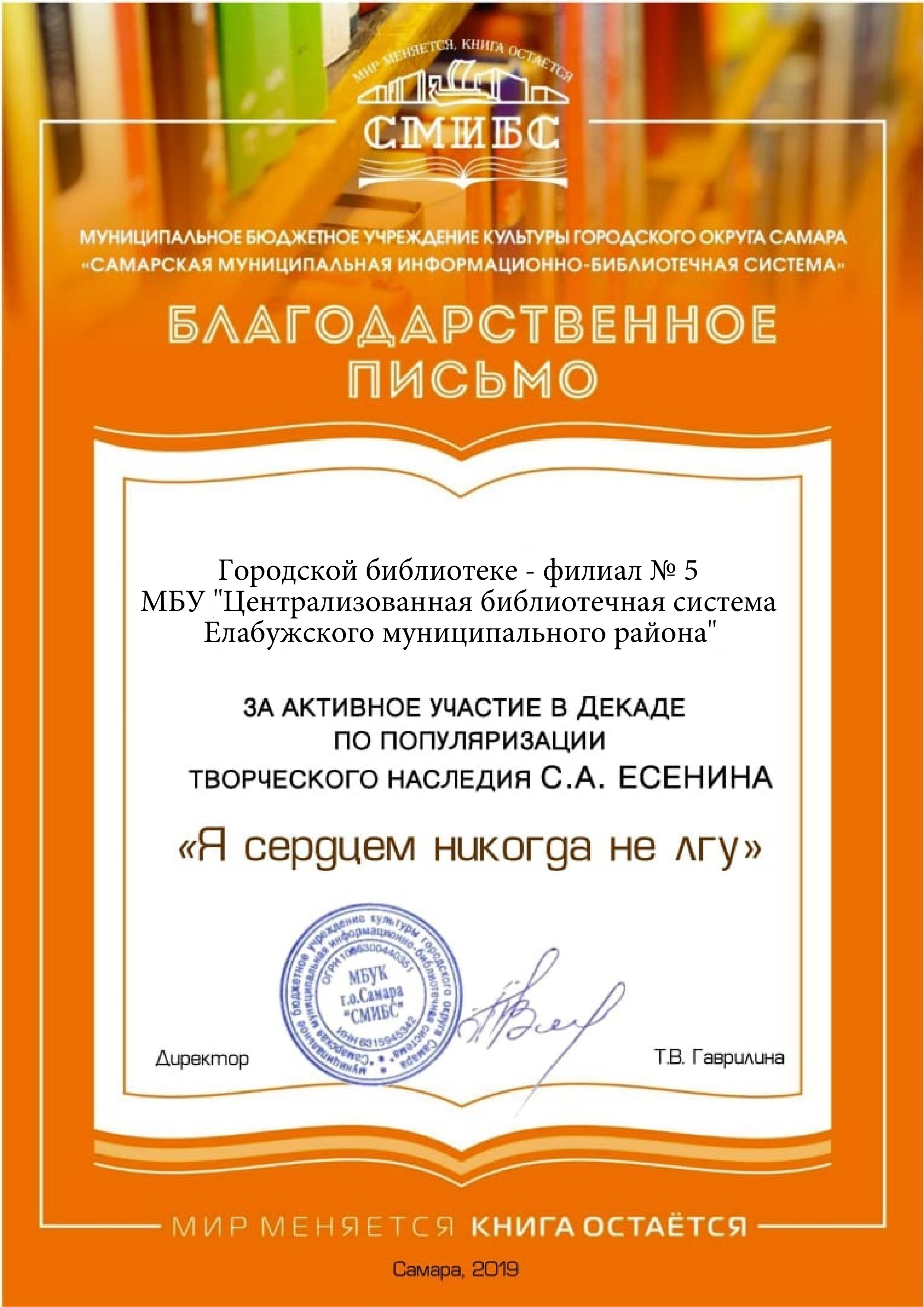 Городская библиотека-филиал № 5 награждена Благодарственным письмом за участие в акции «Я сердцем никогда не лгу» по популяризации творческого наследия С.А. Есенина.
