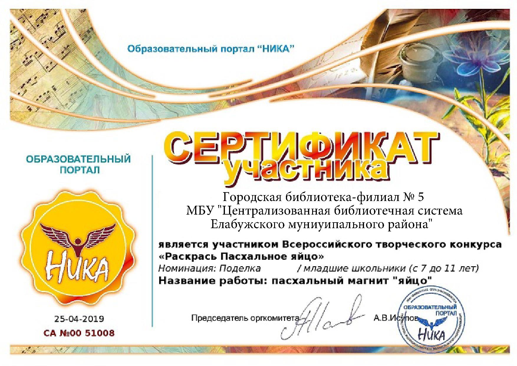К Пасхе и ко дню рождения Карла Фаберже Образовательный портал "НИКА" проводил всероссийский творческий конкурс «Раскрась Пасхальное яйцо». Городская библиотека-филиал № 5 приняла участие и награждена сертификатом.