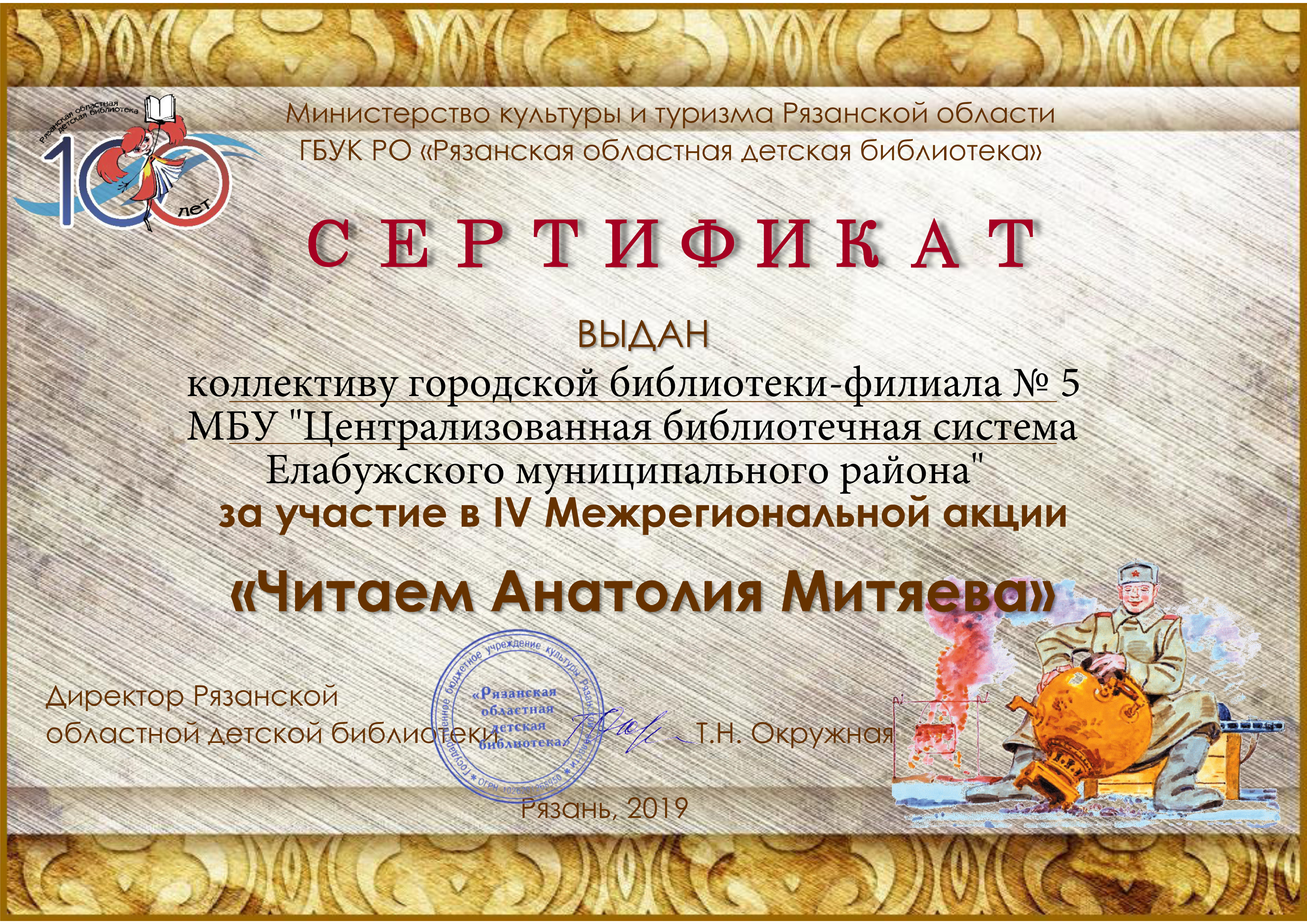 Коллектив городской библиотеки - филиала № 5 принял участие в IV Межрегиональной акции «Читаем Анатолия Митяева» и награждён сертификатом. Анатолий Васильевич Митяев - писатель, сценарист, ответственный секретарь детской газеты "Пионерская правда", главный редактор детского журнала "Мурзилка", главный редактор студии "Союзмультфильм".
