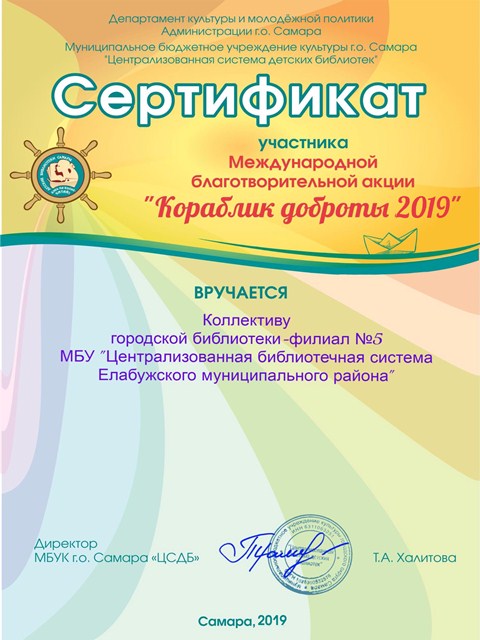Коллектив городской библиотеки – филиала № 5 принял участие в международной благотворительной акции «Кораблик доброты 2019» и был награждён Сертификатом участника.