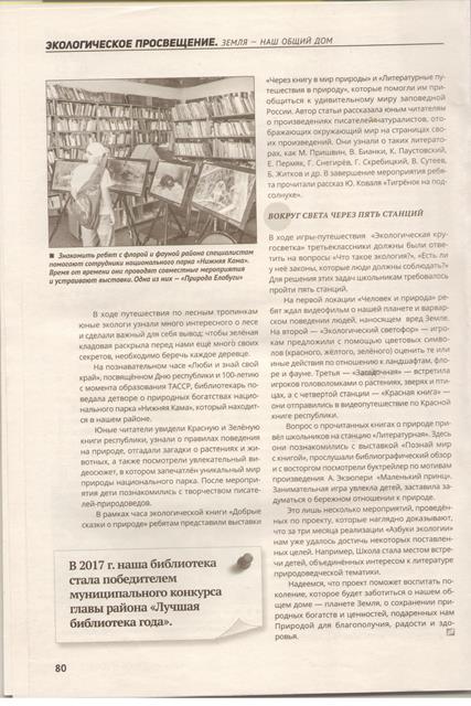"А чем я могу помочь природе" под таким названием вышла статья ведущего библиотекаря городской библиотеки – филиала №6 МБУ «ЦБС» Н.В. Гусевой в профессиональном журнале «Библиополе», 2019, №8.