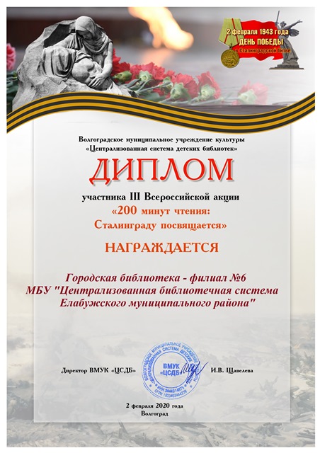 Городская библиотека - филиал № 6 получила Диплом за участие в III Всероссийской акции «200 минут чтения: Сталинграду посвящается». Акция организована МУК «Централизованная система детских библиотек» города Волгограда.