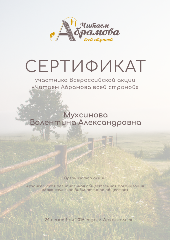 29 февраля 2020 года исполнится 100 лет со дня рождения Ф. А. Абрамова-мастера остросоциальной прозы. В целях продвижения и популяризации литературного наследия писателя Архангельское библиотечное общество и Архангельская областная научная библиотека имени Н. А. Добролюбова проводит Всероссийскую акцию "Читаем Абрамова всей страной". Заведующая информационно-библиографическим отделом МБУ "ЦБС" В. А. Мухсинова присоеденилась к акции.