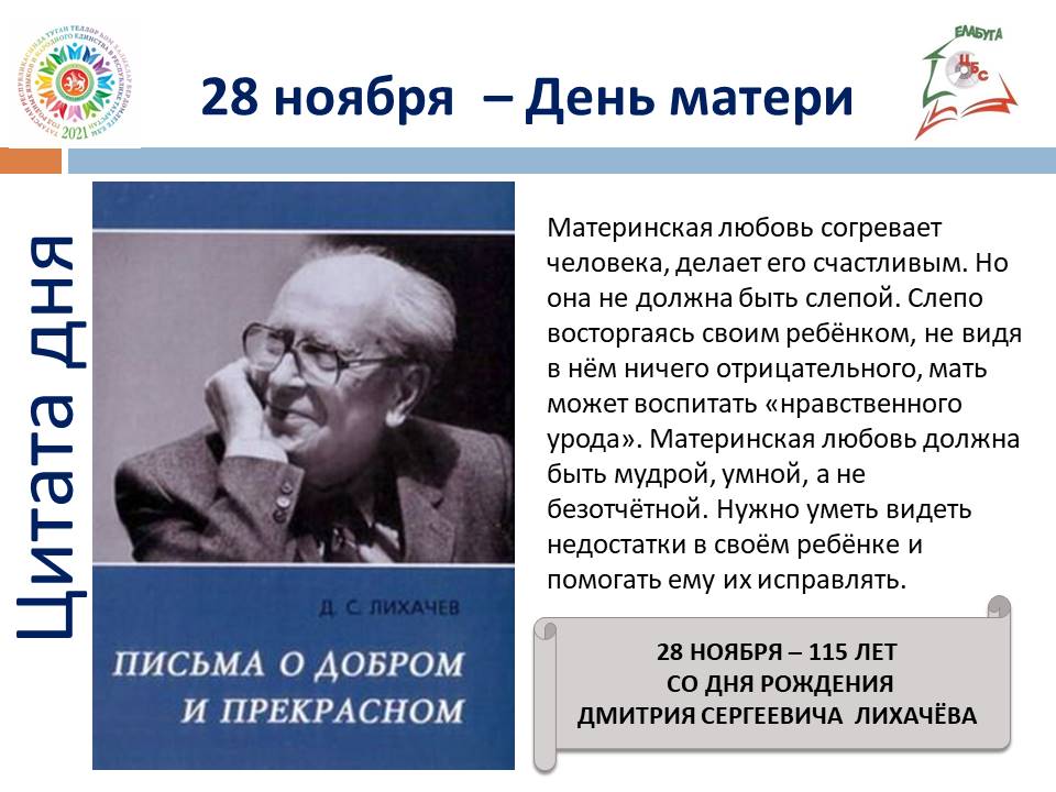 Сегодняшняя цитата о материнской любви из «Писем о добром и прекрасном» - замечательной книги для всех поколений. Автор – Дмитрий Сергеевич Лихачёв - выдающийся учёный, философ, филолог, историк культуры, академик, которого называют символом национальной духовности.