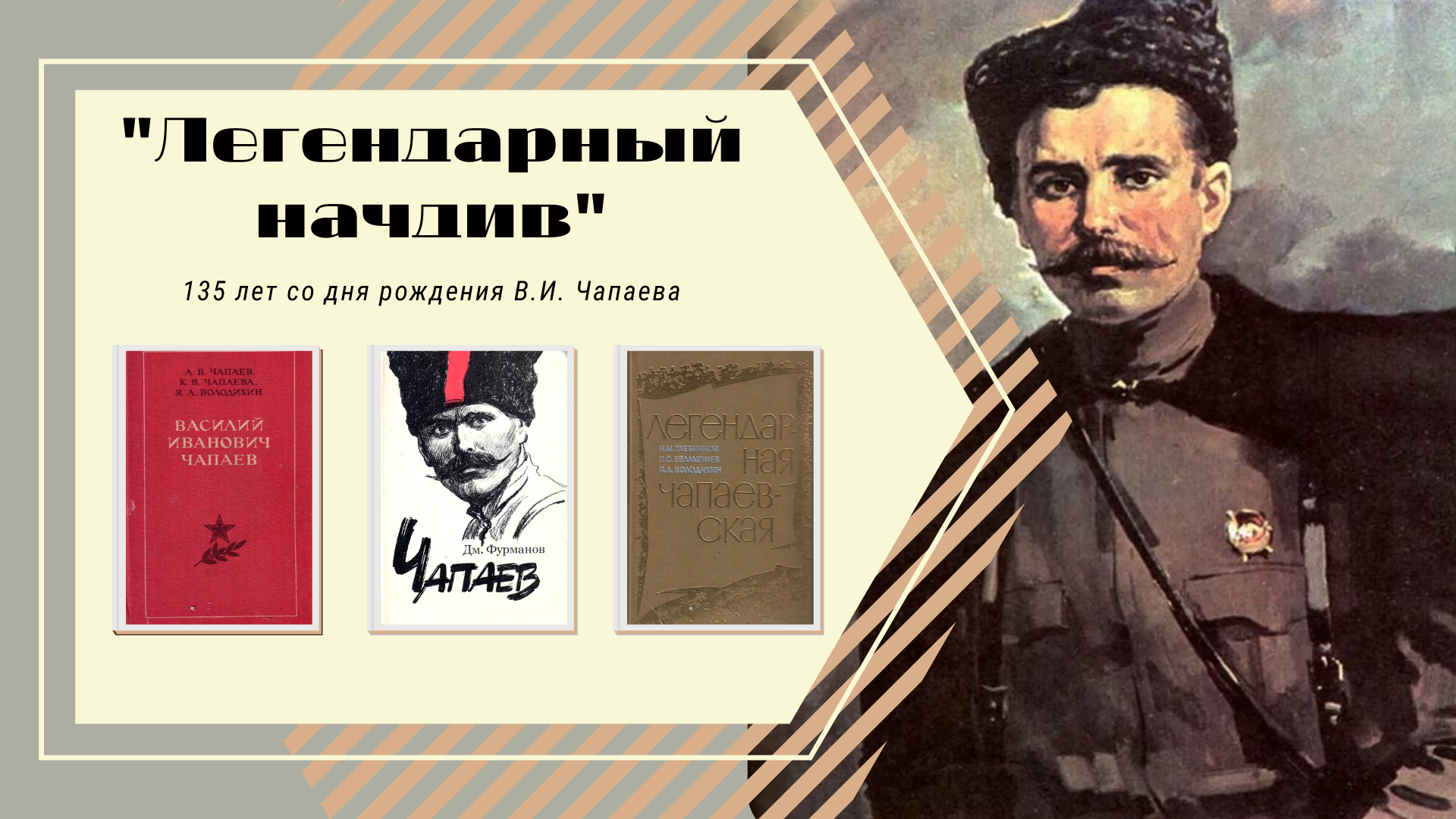 В честь 135-летия В.И. Чапаева абонемент Центральной библиотеки имени А.С. Пушкина представляет онлайн-рекомендацию «Легендарный начдив – В.И. Чапаев». Здесь вы сможете познакомиться с документальными книгами: «Василий Иванович Чапаев» А.В. Чапаев, К.В. Чапаева, Я.А. Володихин, «Легендарная чапаевская» Н.М. Хлебникова, П.С. Евлампиев, Я.А. Володихин; а так же художественным произведением Дмитрия Фурманова «Чапаев».
