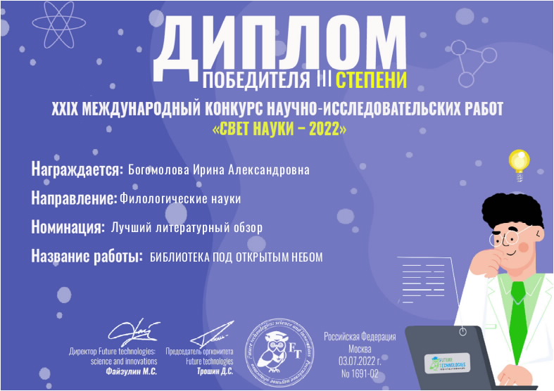 Ранее работа И.А Богомоловой и Ю.В. Назиповой «Библиотекарь и читатель: 125 лет вместе» приняла участие в XXVIII Международном конкурсе научно-исследовательских работ «Старт в науке – 2022» от Российского научного общества "Future technologies: science and innovations", (3 мая 2022 г. по 31 мая 2022 г.). Результат: Благодарность и Диплом победителя III степени.