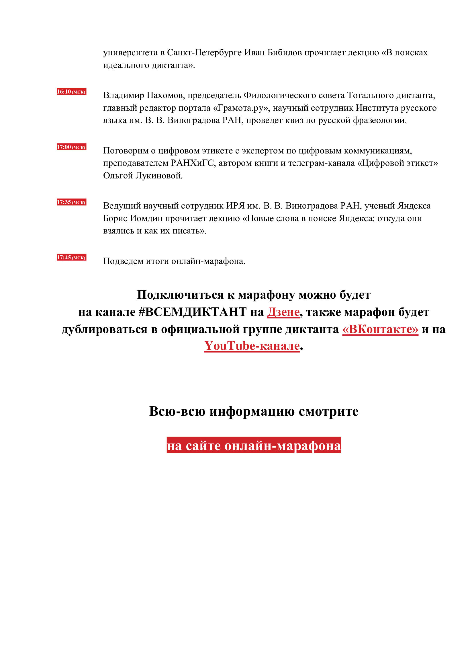 Подключиться к марафону можно будет на канале #ВСЕМДИКТАНТ на Дзене, также марафон будет дублироваться в официальной группе диктанта «ВКонтакте» и на YouTube-канале.