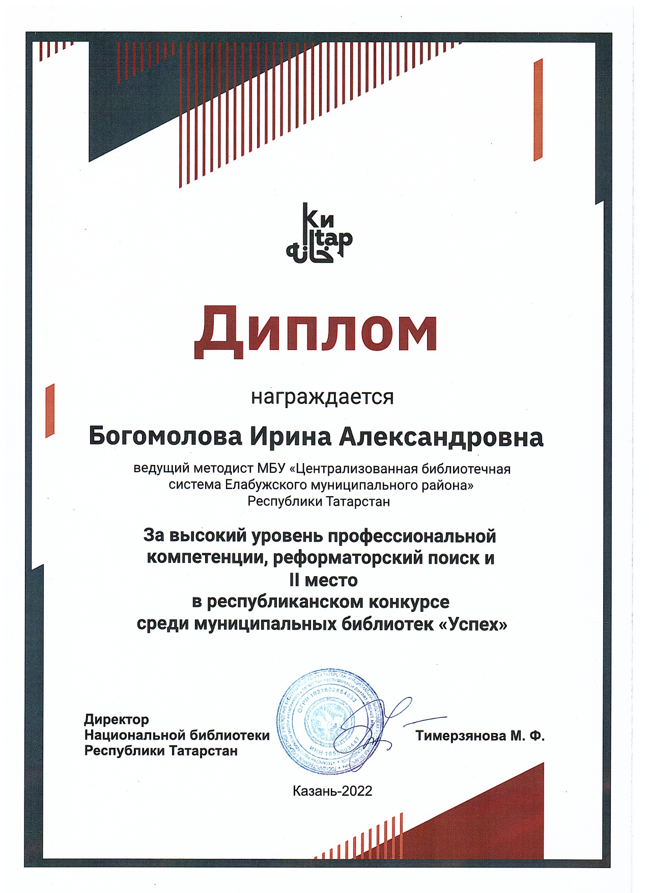 Ведущий методист Елабужской ЦБС Ирина Александровна Богомолова награждена Дипломом за II место в республиканском конкурсе «Успех».