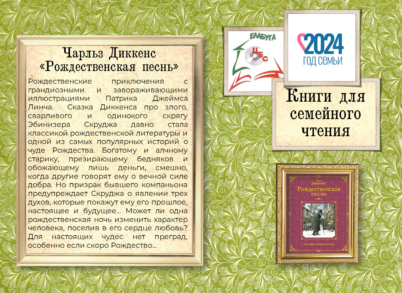В Год семьи в России абонемент Центральной библиотеки имени А.С. Пушкина продолжает рубрику "Книги для семейного чтения" и рекомендует произведение "Рождественская песнь" Чарльза Диккенса.