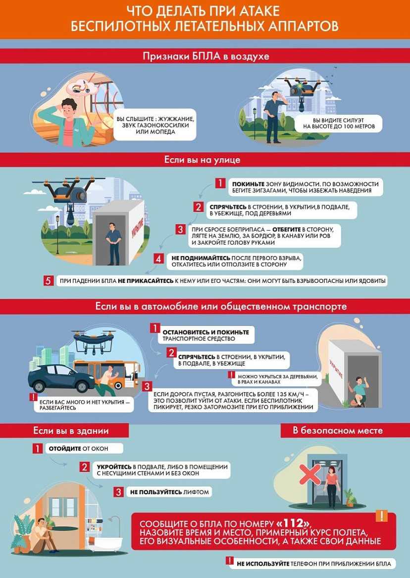 Если в момент нападения БПЛА люди находятся в здании, специалисты рекомендуют им по возможности спуститься на самые нижние этажи, в подвал и паркинг. Пользоваться лифтом нельзя!