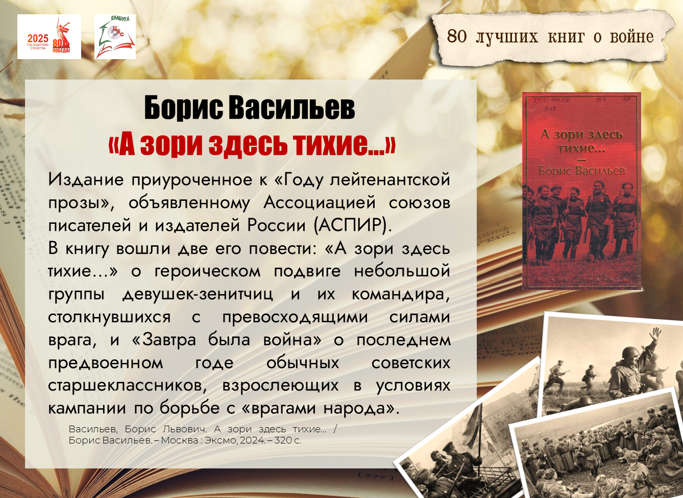 В Год 80-летия Победы в Великой Отечественной войне абонемент Центральной библиотеки имени А.С. Пушкина предлагает вниманию читателей флешбук "80 лучших книг о войне". В рамках данной рубрики рекомендуем к прочтению книгу Бориса Васильева "А зори здесь тихие...".