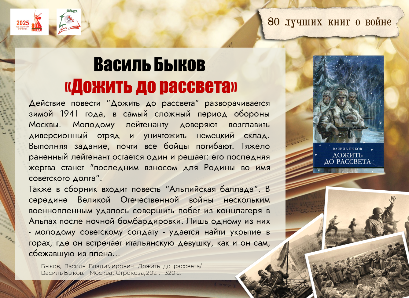 В Год 80-летия Победы в Великой Отечественной войне абонемент Центральной библиотеки имени А.С. Пушкина предлагает вниманию читателей флешбук "80 лучших книг о войне". В рамках данной рубрики рекомендуем к прочтению книгу Василя Быкова "Дожить до рассвета".