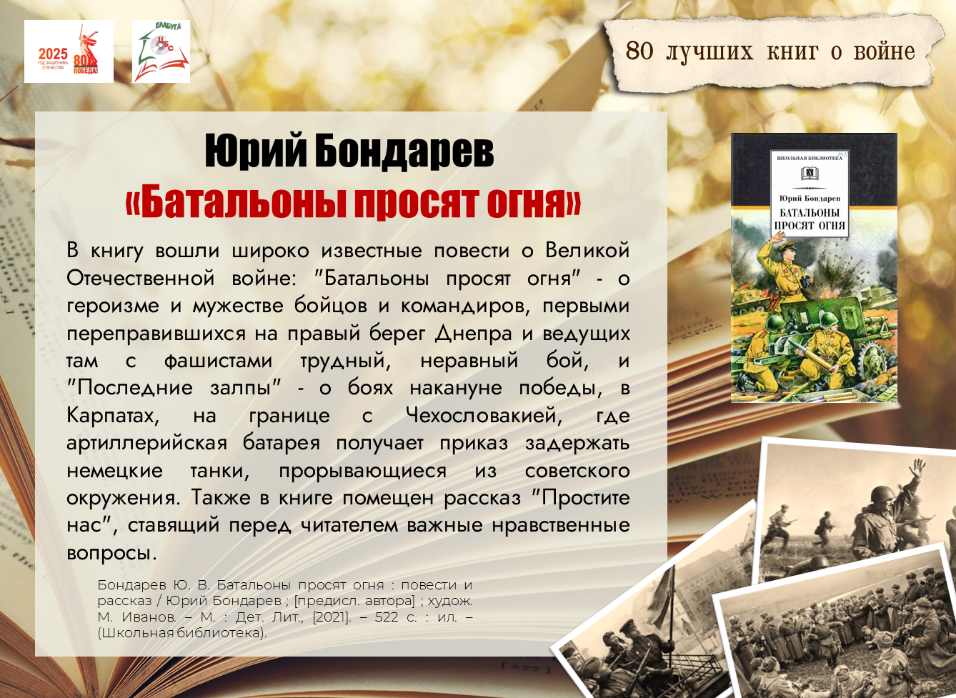 В Год 80-летия Победы в Великой Отечественной войне абонемент Центральной библиотеки имени А.С. Пушкина предлагает вниманию читателей флешбук "80 лучших книг о войне". В рамках данной рубрики рекомендуем к прочтению книгу Юрия Бондарева "Батальоны просят огня".