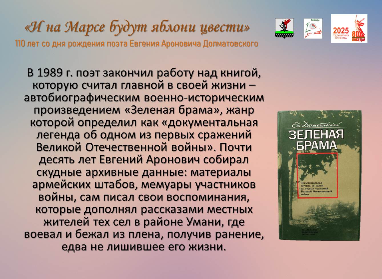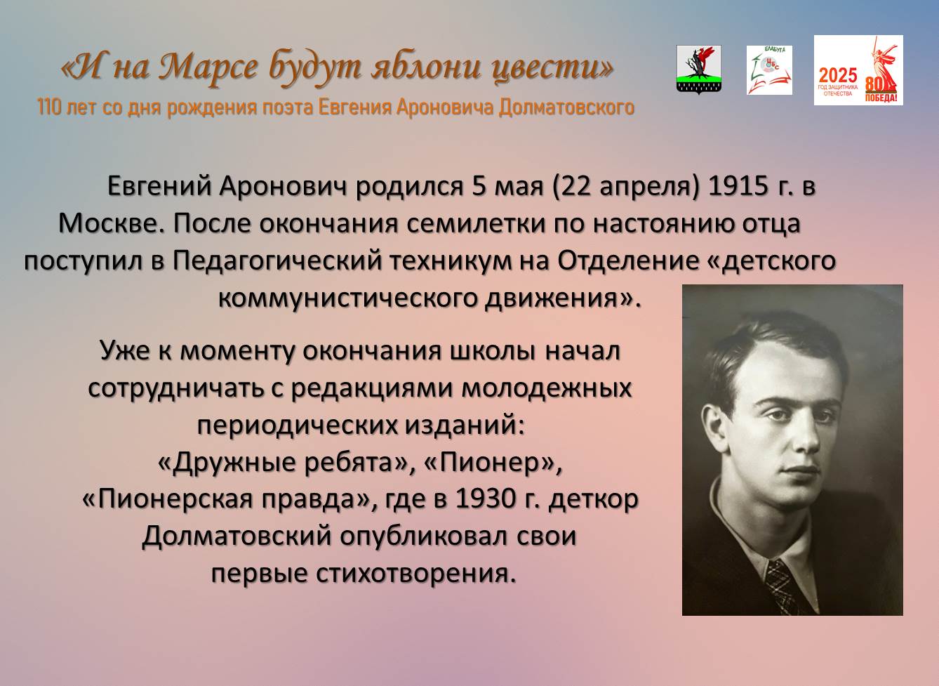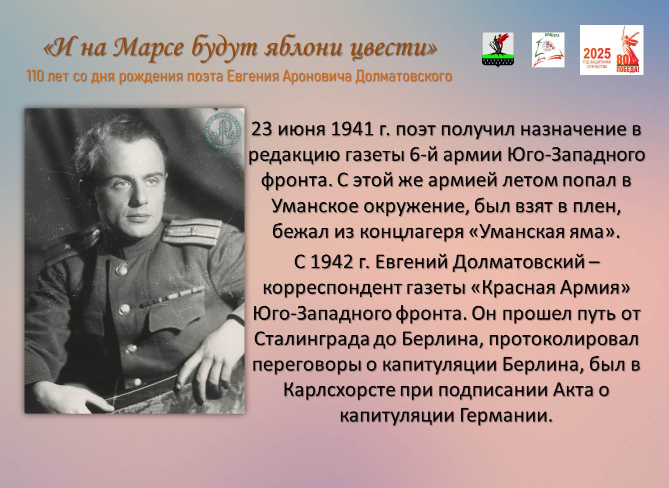 Абонемент Центральной библиотеки имени А.С. Пушкина представляет информационную страницу в честь 110-летия со дня рождения поэта Евгения Ароновича Долматовского.