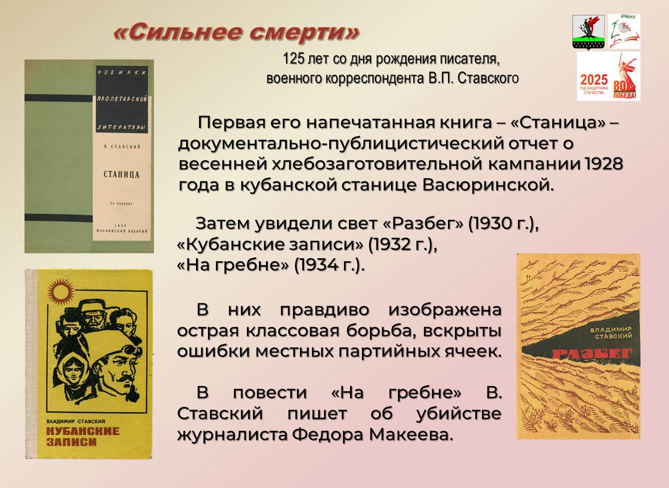 12 августа в рамках Года 80-летия Победы абонемент Центральной библиотеки имени А.С. Пушкина представляет литературное предложение «Сильнее смерти» в честь 125-летия со дня рождения писателя, военного корреспондента Владимира Петровича Ставского (настоящая фамилия Кирпичников, 12.08.1900-14.11.1943).
