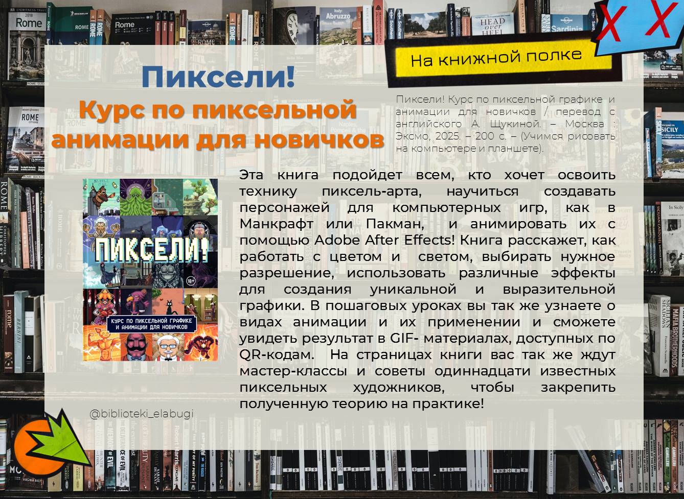 Абонемент Центральной библиотеки имени А.С. Пушкина продолжает рубрику литературных рекомендаций современной литературы и предлагает вниманию читателей книгу "Пиксели! Курс по пиксельной графике и анимации для новичков!"
