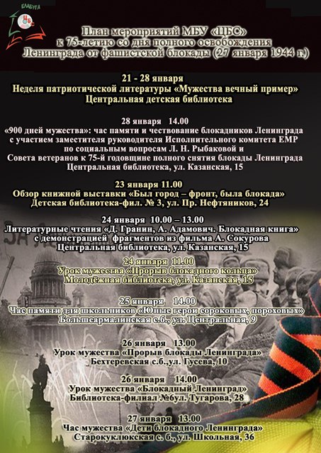 План мероприятий МБУ «ЦБС» к 75-летию со дня полного освобождения Ленинграда от фашистской блокады (27 января 1944 г.)