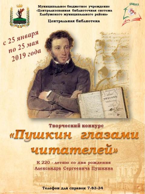 С 25 января по 25 мая 2019 г. Центральная библиотека МБУ «Централизованная библиотечная система Елабужского муниципального района» приглашает вас принять участие в муниципальном творческом конкурсе «Пушкин глазами читателей», приуроченный к 220-летию со дня рождения А.С. Пушкина.