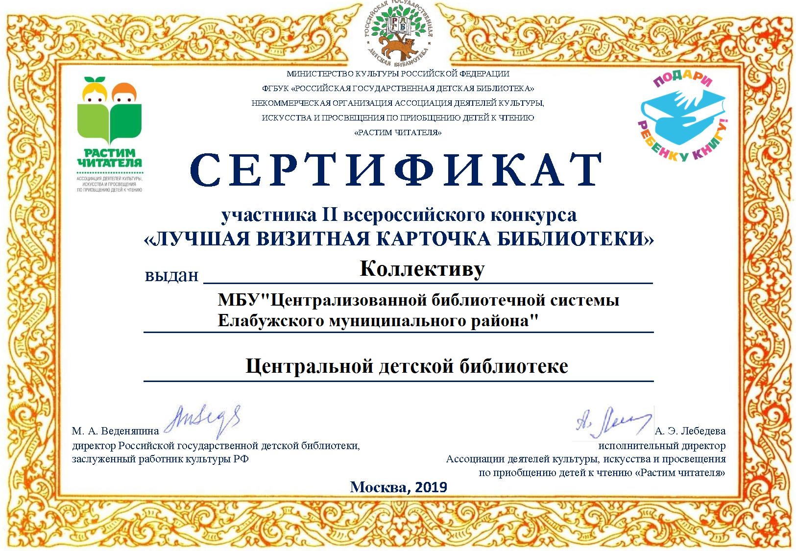 Награждается коллектив Центральной детской библиотеки сертификат участника II Всероссийского конкурса "Лучшая визитная карточка библиотеки"