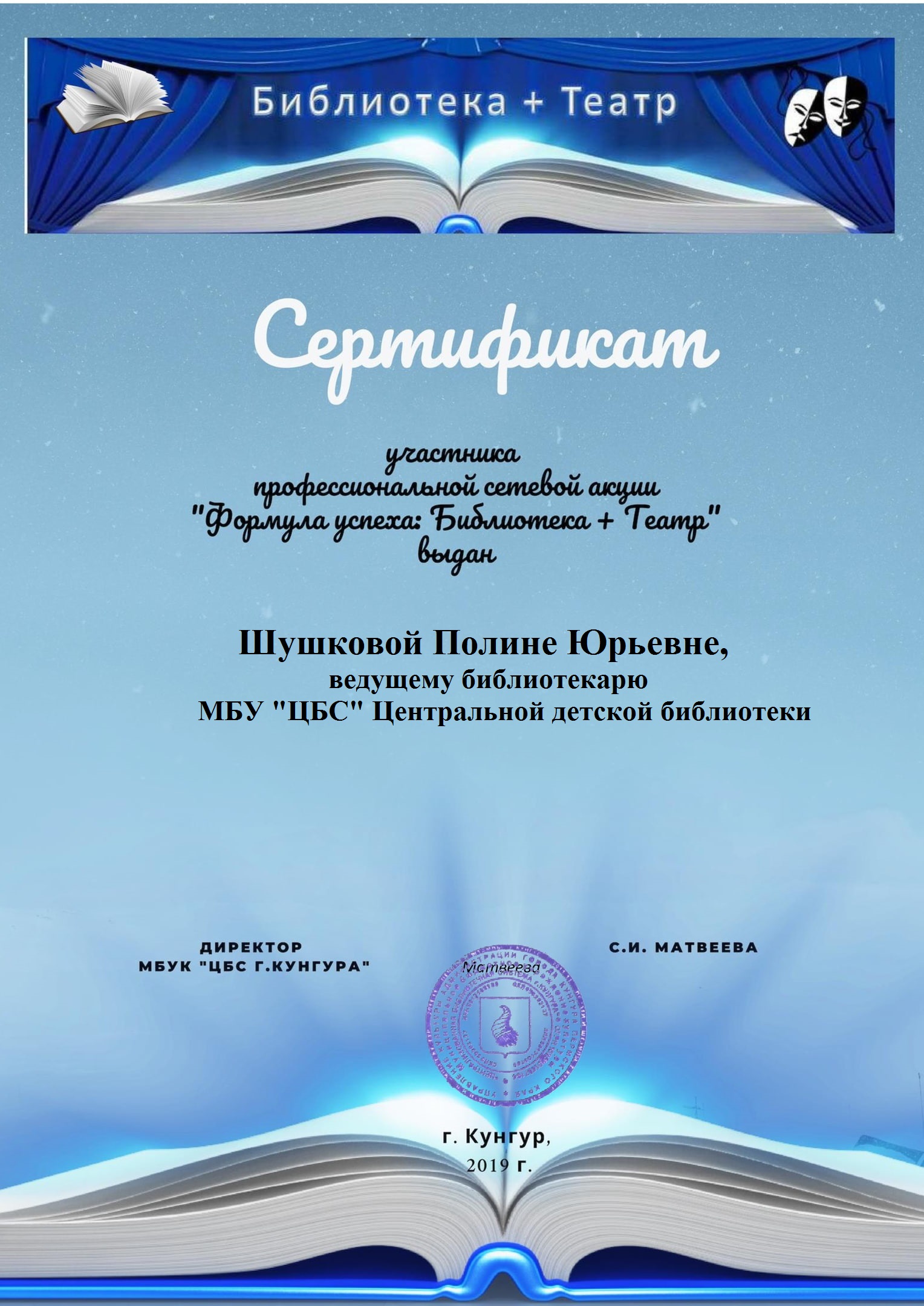 Библиотекари Центральной детской библиотеки в Год театра получили Сертификаты за участие в Профессиональной сетевой акции «Формула успеха: Библиотека + Театр». Организатор акции Центральная городская библиотека им. К.Т. Хлебникова "МБУК ЦБС г.Кунгура" Пермского края.