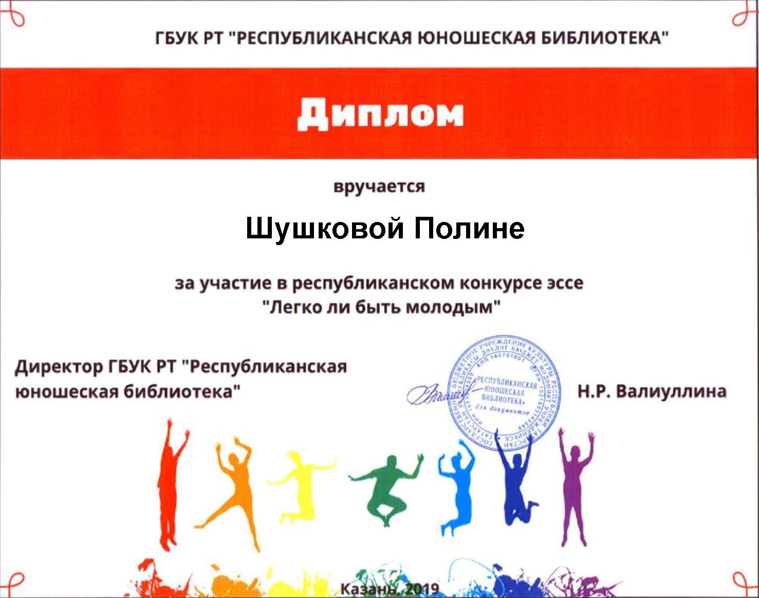 Шушкова Полина Юрьевна, ведущий библиотекарь Центральной детской библиотеки получила Диплом за участие в Республиканском конкурсе эссе "Легко ли быть молодым". Учредителем конкурса являлось Министерство культуры Республики Татарстан, организатор конкурса ГБУК РТ "Республиканская юношеская библиотека".