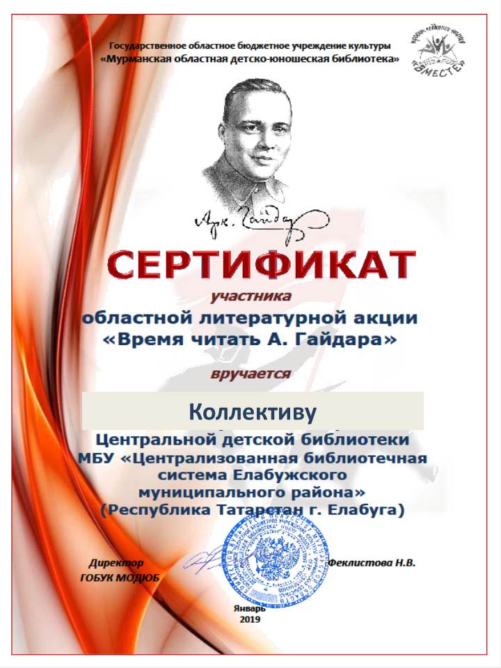 Центральная детская библиотека получила Сертификат за участие Региональная литературная акция "Время читать Гайдара". Организатором Акции является Государственное областное бюджетное учреждение культуры «Мурманская областная детско-юношеская библиотека».