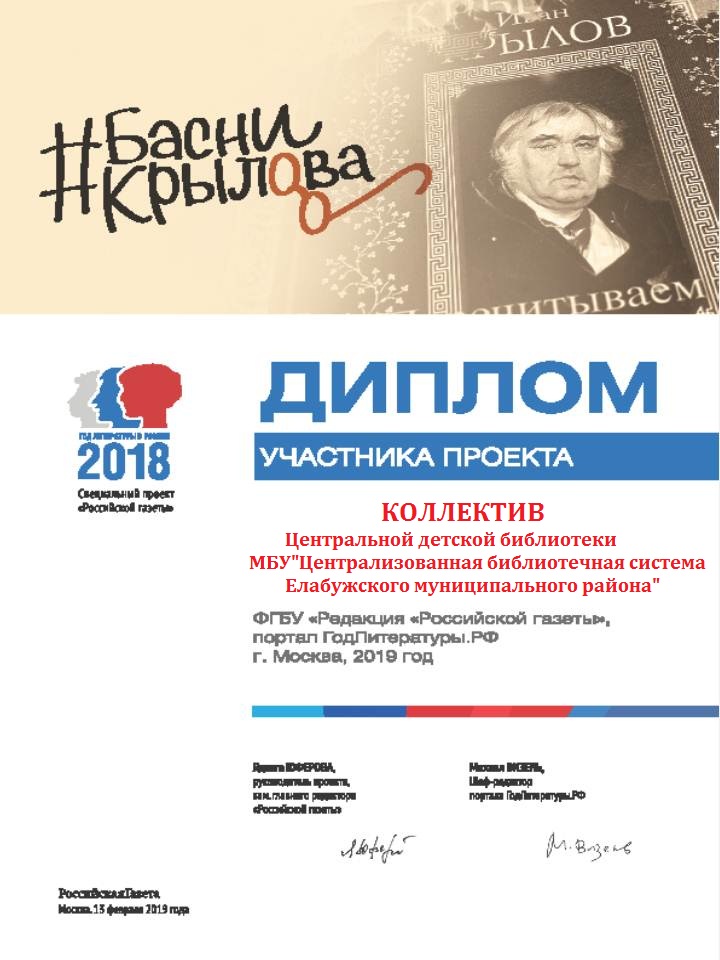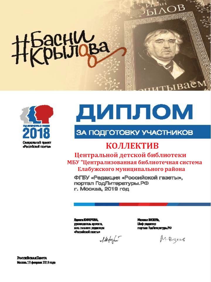 Центральная детская библиотека получила Дипломы за участие в конкурсе "Басни Крылова почитаем вместе". Организатор: «Российская газета» и портал «Год Литературы».