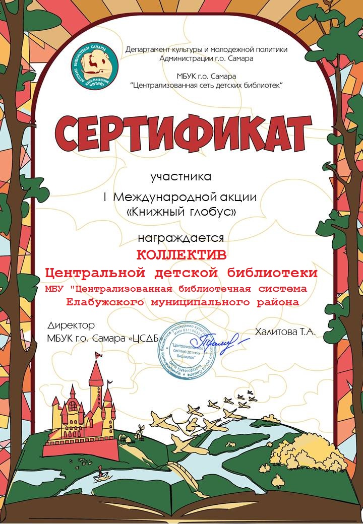 Центральная детская библиотека получила Благодарственное письмо и Сертификат за участие в I Межрегиональной Акции «Книжный глобус». Организатором Акции является «Централизованная сист