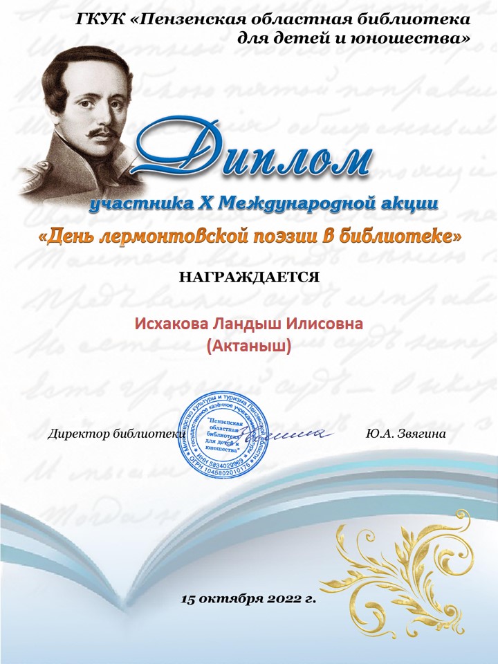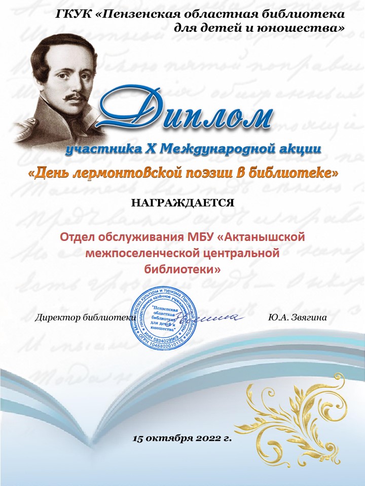 Отдел обслуживания центральной библиотеки и учащиеся АСОШ №1, 2 участвовали в X Межрегиональной акции «Дни лермонтовской поэзии в библиотеке» и награждены дипломами.