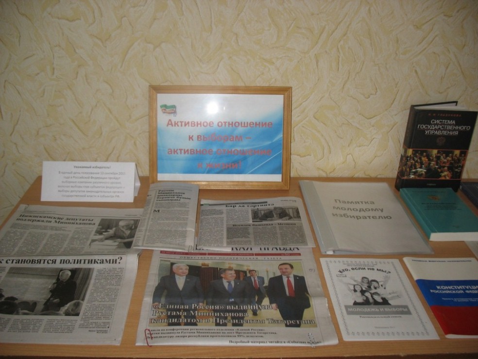 Для того, чтобы сформировать у избирателей, в том числе и молодых избирателей позитивное представление о выборах, как одном из главных демократических институтов, обеспечивающих реализацию народного волеизъявления в нашей библиотеке с 27 июля 2015 года работает информационный стол «Активное отношение к выборам – активное отношение к жизни!»