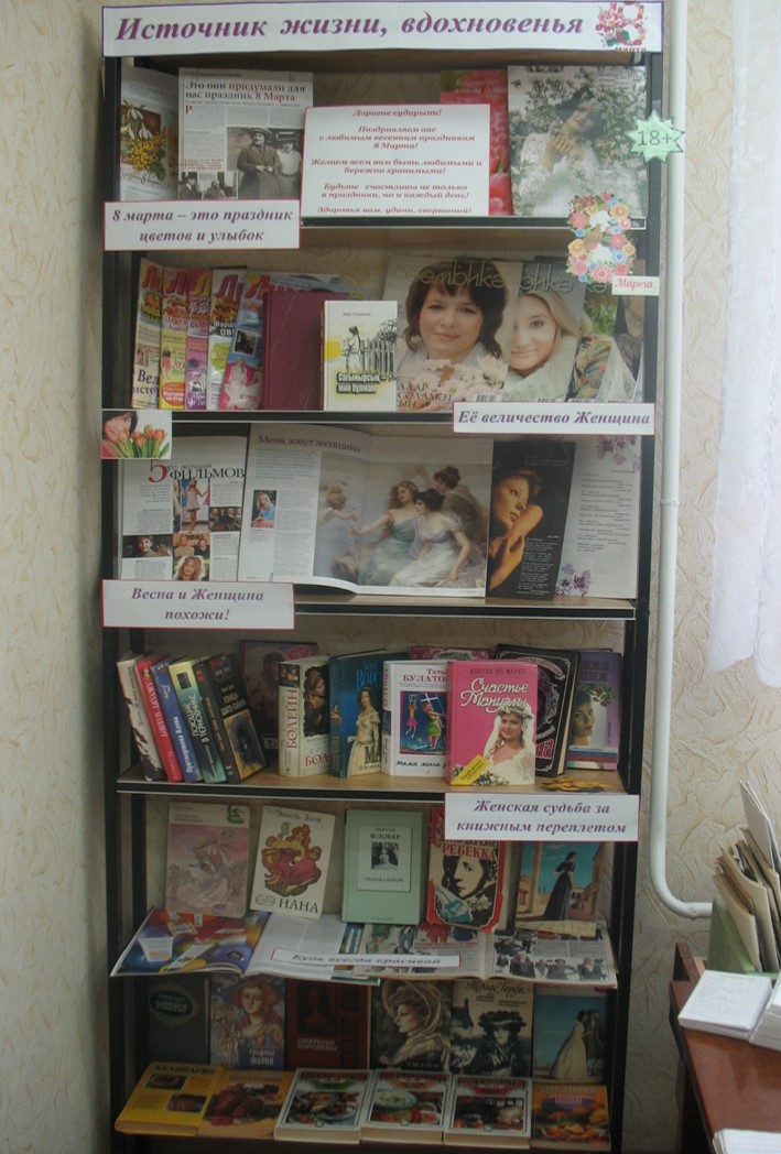 К Международному женскому дню 8 марта на абонементе оформлена иллюстрированная книжная выставка-обзор «Источник жизни, вдохновенья". Данная выставка включила в себя материал об истории праздника, косметологии, рукоделию, домоводству, астрологии и др. Также на выставке представлены женские романы российских и зарубежных авторов. Книжная выставка ярко оформлена, красочно иллюстрирована, содержит интересный материал, чем привлекает внимание читателей разных возрастов.