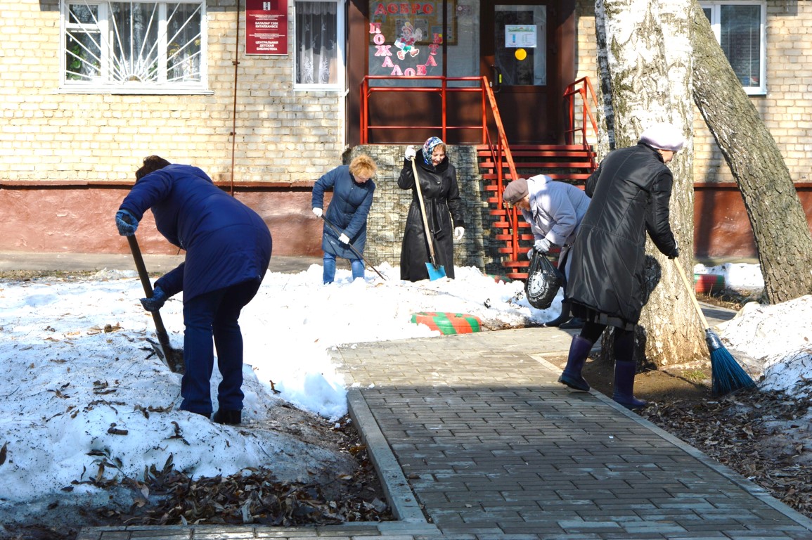 12 апреля с 09.00 до 10.00 коллектив библиотеки провел средник по уборке территории, прилегающей к библиотеке. Были выполнены следующие работы: рыхление снега и уборка мусора. В среднике участвовали следующие сотрудники: Рыжакова Н.Х., Рахимова Л.С., Токачева Е.Д., Свешникова В.Л., Бадретдинова Ф.Х., Тактарова Р.М., Иванова Р.Г.