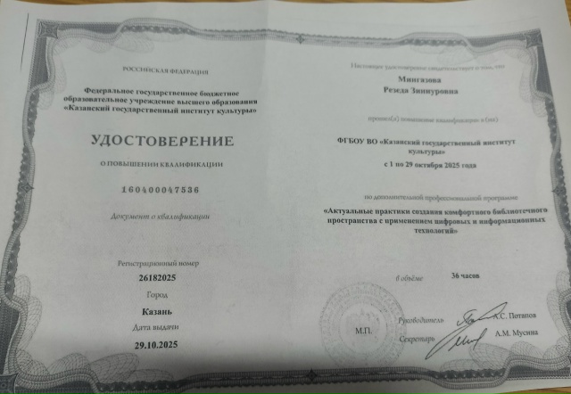 Удостоверение о повышении квалификации выдан библиотекарю Буралинской сельской библиотеки.