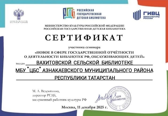 Сертификат участника семинара выдан библиотекарю Вахитовской сельской библиотеки.
