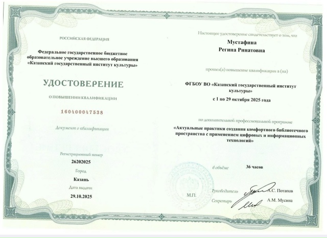 Сертификат о повышении квалификации выдан библиотекарю Какре-Елгинской сельской библиотеки.