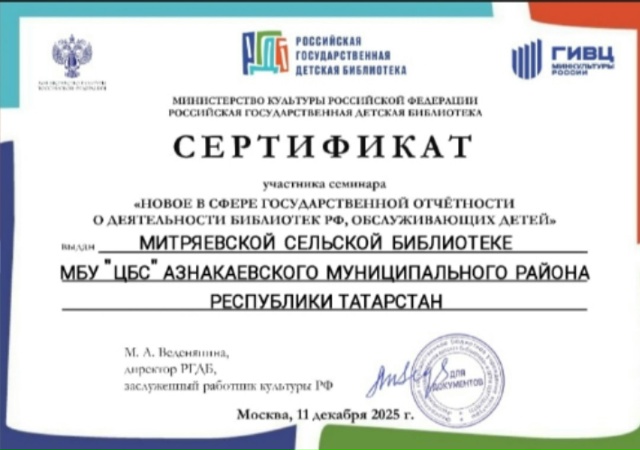 Сертификат участника семинара выдан библиотекарю Митряевской сельской библиотеки.