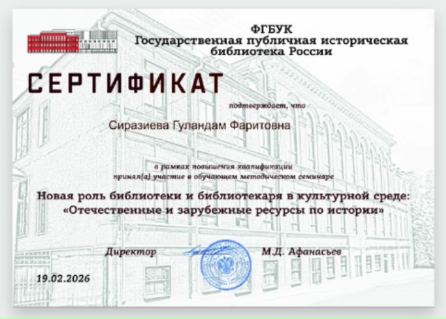 Сертификат о повышении квалификации в методическом семинаре выдан библиотекарю Митряевской сельской библиотеки.