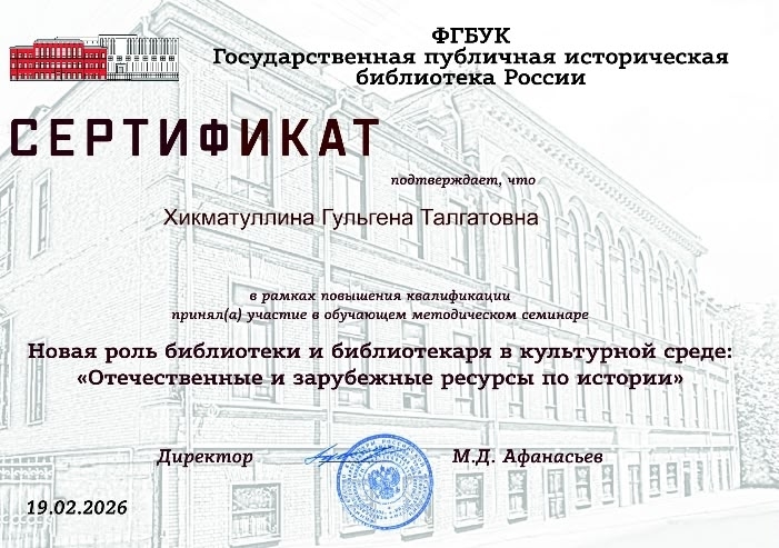 В рамках повышения квалификации приняла участие в обучающем методическом семинаре "Новая роль библиотеки и библиотекаря в культурной среде": «Отечественные и зарубежные ресурсы по истории».